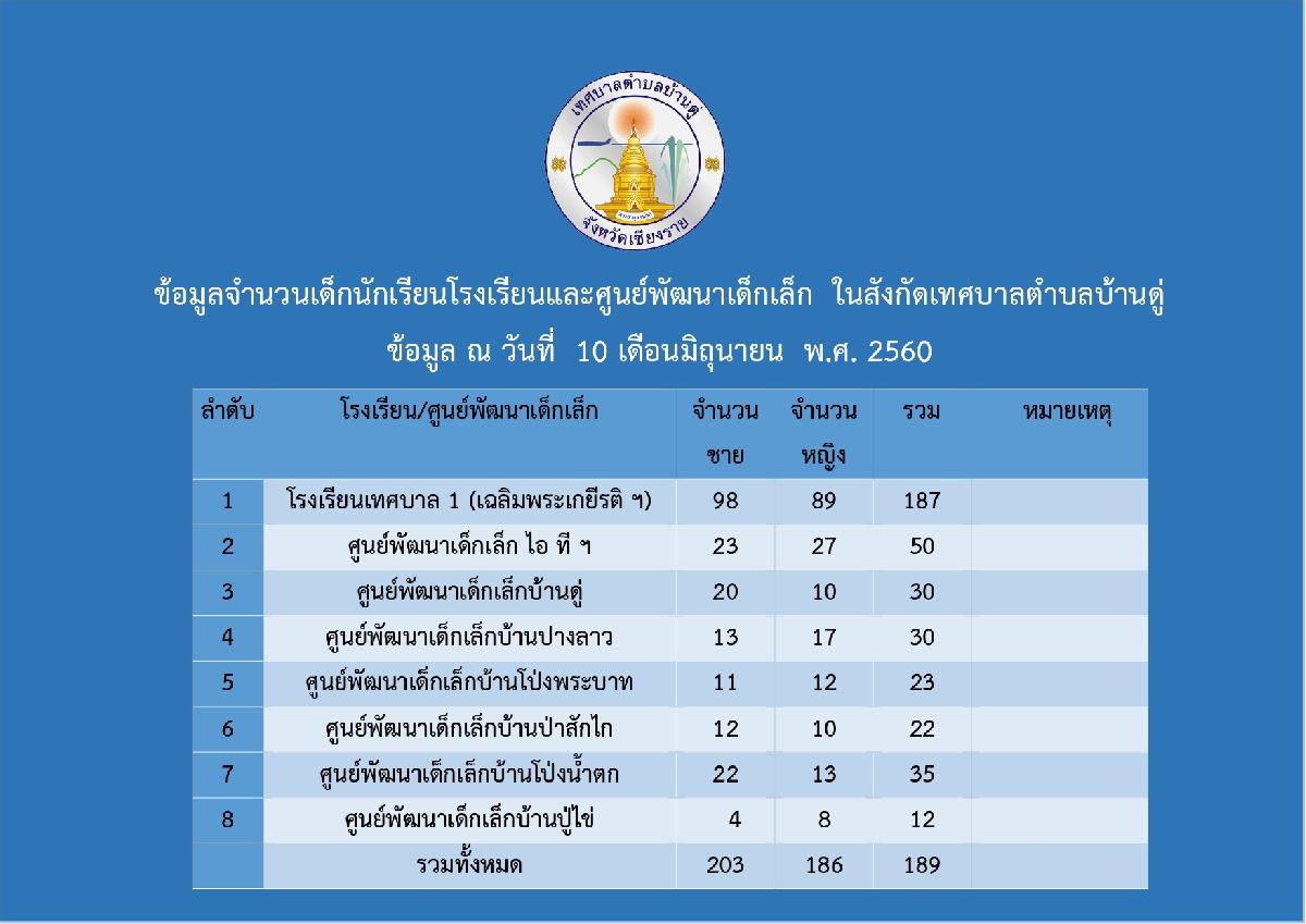 ข้อมูลจำนวนเด็กนักเรียนโรงเรียนและศูนย์พัฒนาเด็กเล็กในสังกัด ทต.บ้านดู่ ณ วันที่ 10 มิถุนายน 2560