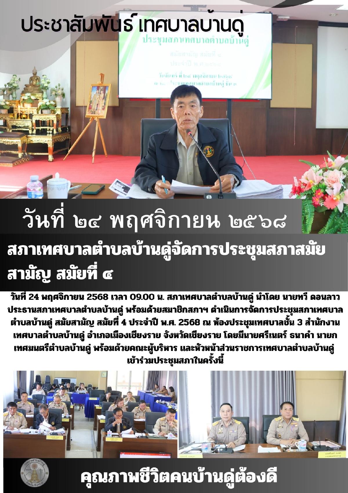 24 พ.ย. 68 สภาเทศบาลตำบลบ้านดู่ จัดการประชุมสภาเทศบาลตำบลบ้านดู่ สมัยสามัญ สมัยที่ 4 ประจำปี พ.ศ. 2568