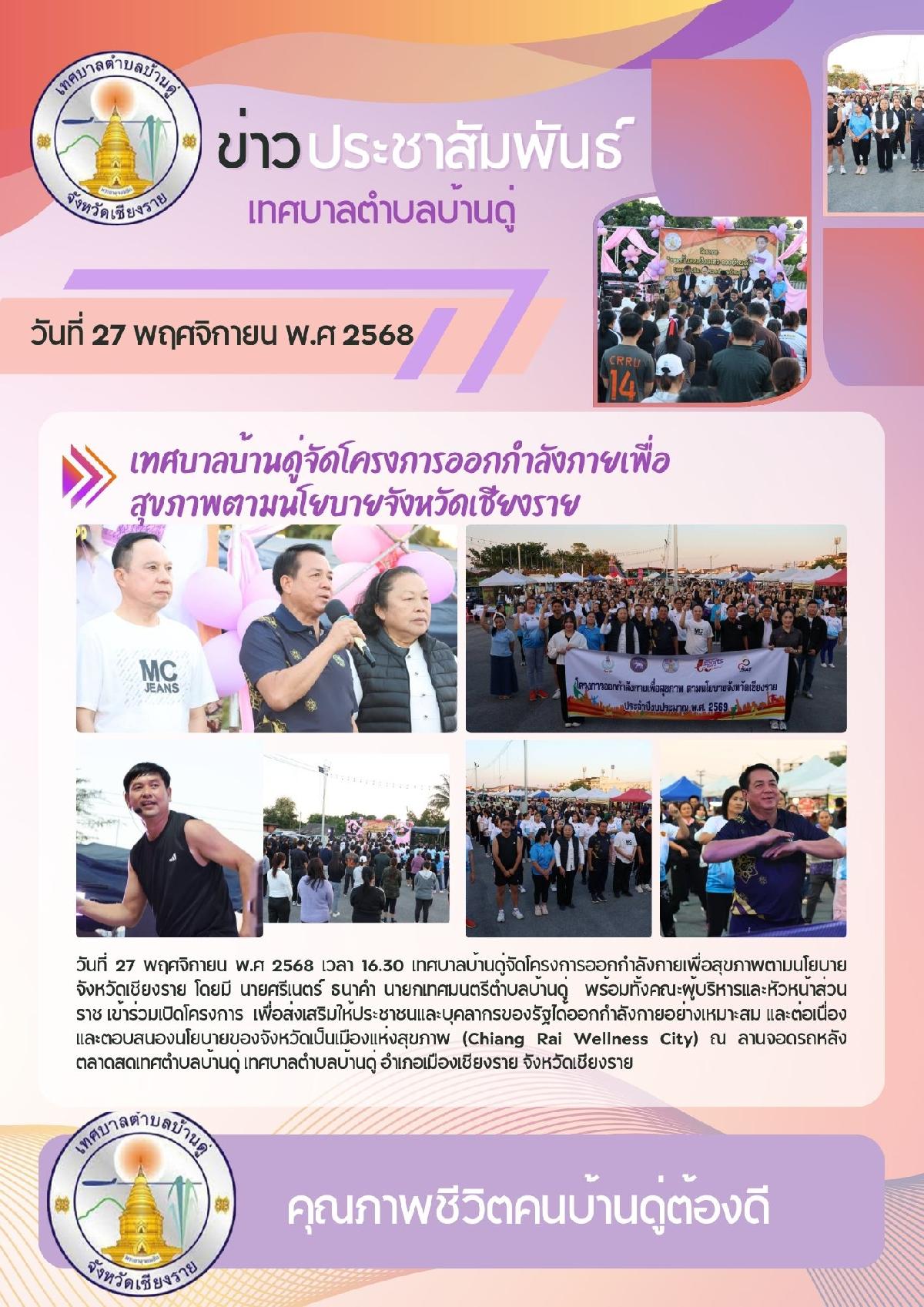 27 พ.ย. 68 เทศบาลตำบลบ้านดู่ จัดโครงการออกกำลังกายเพื่อสุขภาพตามนโยบายจังหวัดเชียงราย