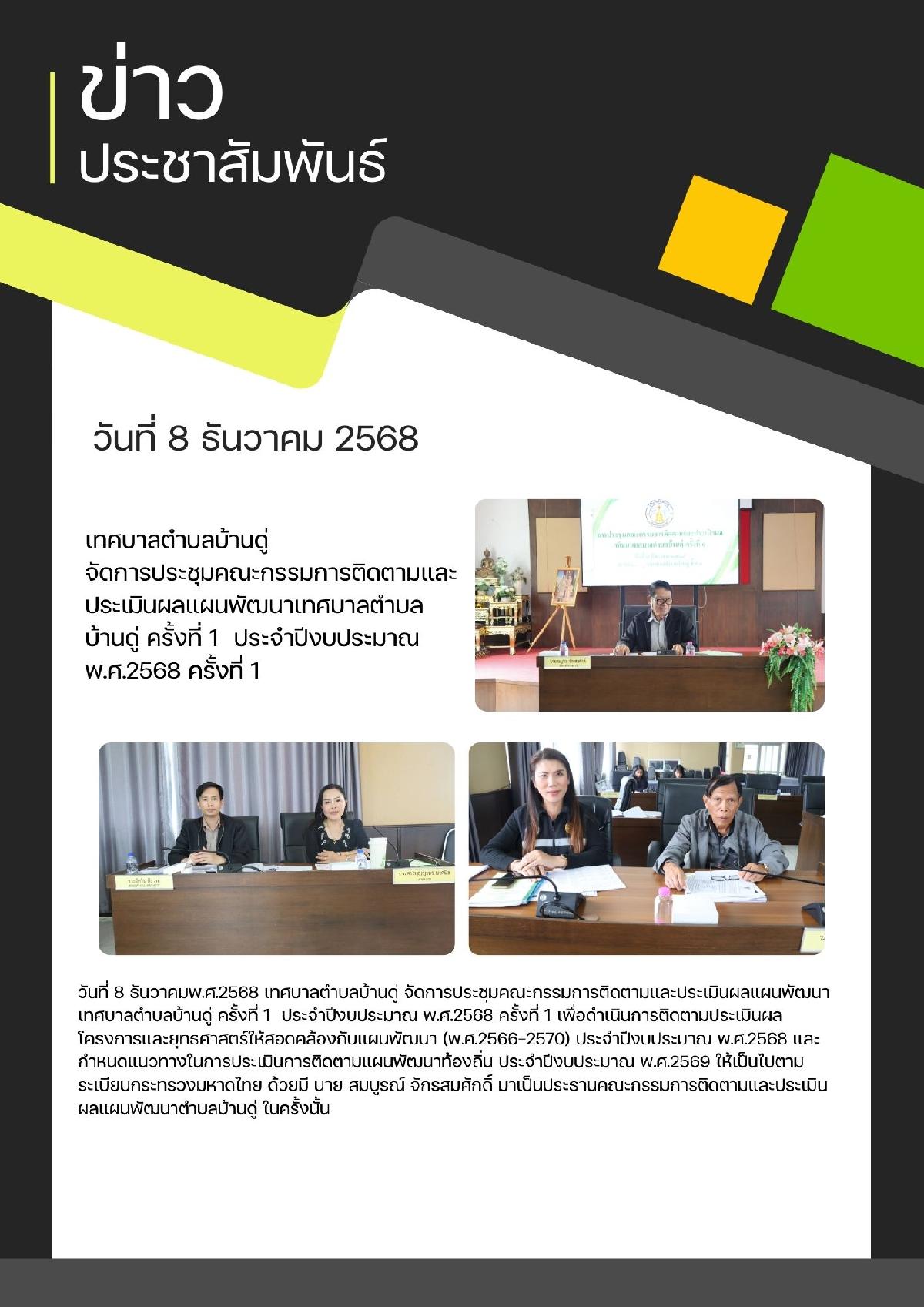 8 ธ.ค. 68 เทศบาลตำบลบ้านดู่ จัดการประชุมคณะกรรมการติดตามและประเมินผลแผนพัฒนาเทศบาลตำบลบ้านดู่ ครั้งที่ 1 ประจำปีงบประมาณ พ.ศ.2568