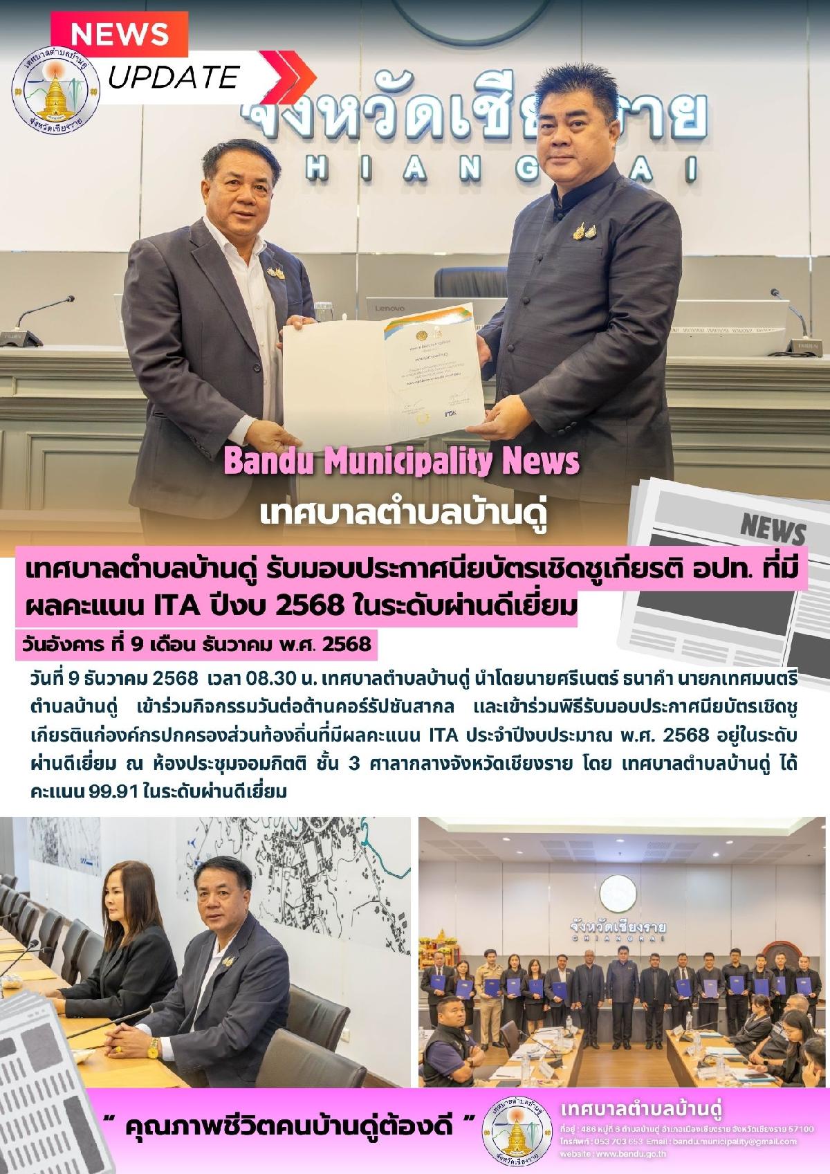 9 ธ.ค. 68 เทศบาลตำบลบ้านดู่ เข้าร่วมกิจกรรมวันต่อต้านคอร์รัปชันสากล และเข้าร่วมพิธีรับมอบประกาศนียบัตรเชิดชู เกียรติแก่องค์กรปกครองส่วนท้องถิ่นที่มีผลคะแนน ITA ประจําปีงบประมาณ พ.ศ. 2568