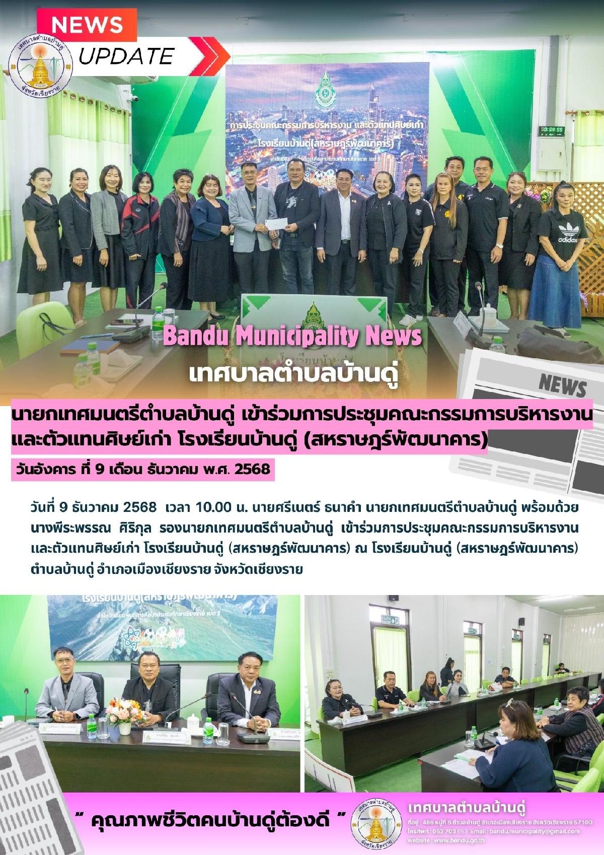9 ธ.ค. 68 นายกเทศมนตรีตำบลบ้านดู่ เข้าร่วมการประชุมคณะกรรมการบริหารงาน และตัวแทนศิษย์เก่า โรงเรียนบ้านดู่ (สหราษฎร์พัฒนาคาร)
