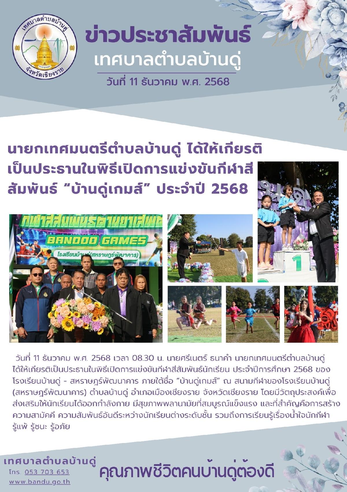 21 พ.ย. 68 นายกเทศมนตรีตำบลบ้านดู่ เป็นประธานในพิธีเปิดการแข่งขันกีฬาสีสัมพันธ์นักเรียน ประจำปีการศึกษา 2568 โรงเรียนบ้านขัวแคร่