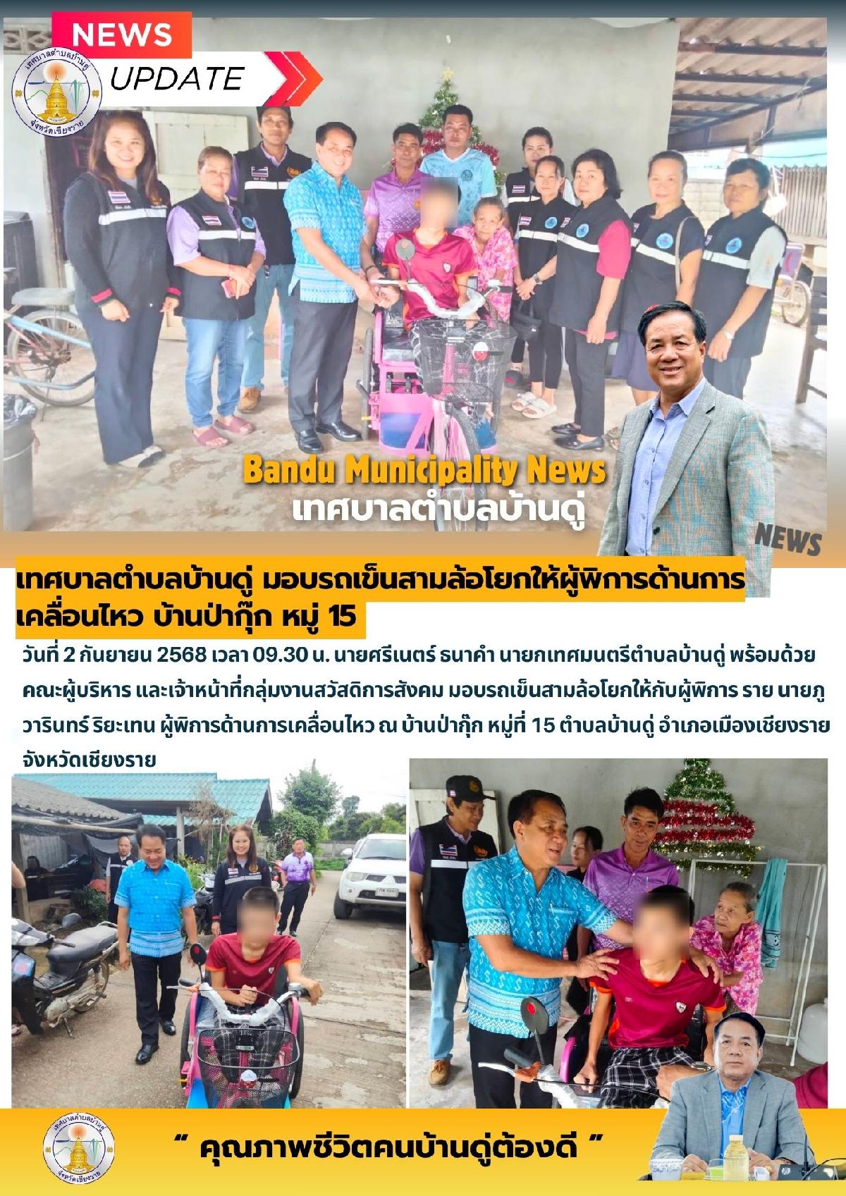 2 ก.ย. 68 เทศบาลตำบลบ้านดู่ มอบรถเข็นสามล้อโยกให้กับผู้พิการ