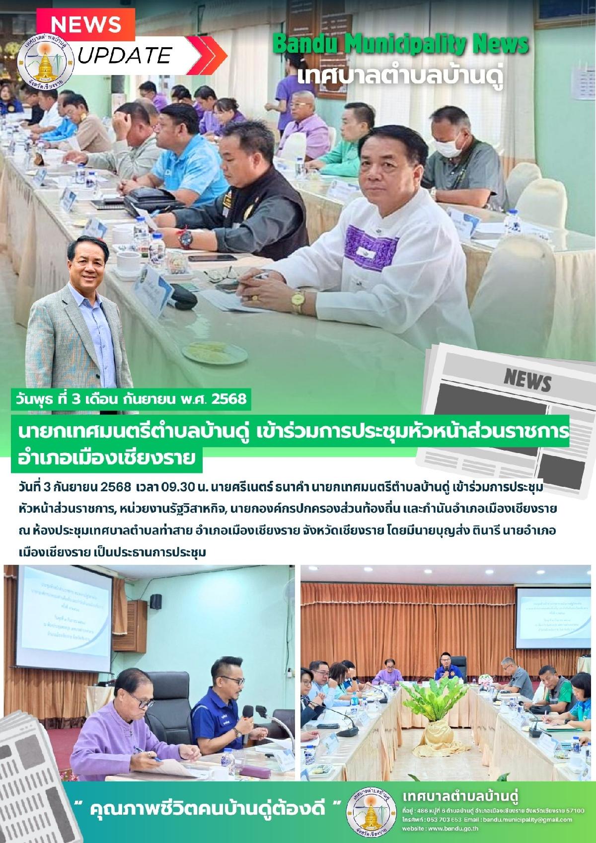 3 ก.ย. 68 นายกเทศมนตรีตำบลบ้านดู่ เข้าร่วมการประชุม หัวหน้าส่วนราชการอำเภอเมืองเชียงราย