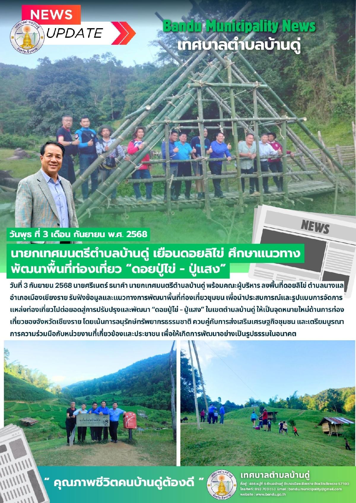 3 ก.ย. 68 นายกเทศมนตรีตำบลบ้านดู่ เยือนดอยลิไข่ ศึกษาแนวทางพัฒนาพื้นที่ท่องเที่ยว "ดอยปู่ไข่ - ปู่แสง"