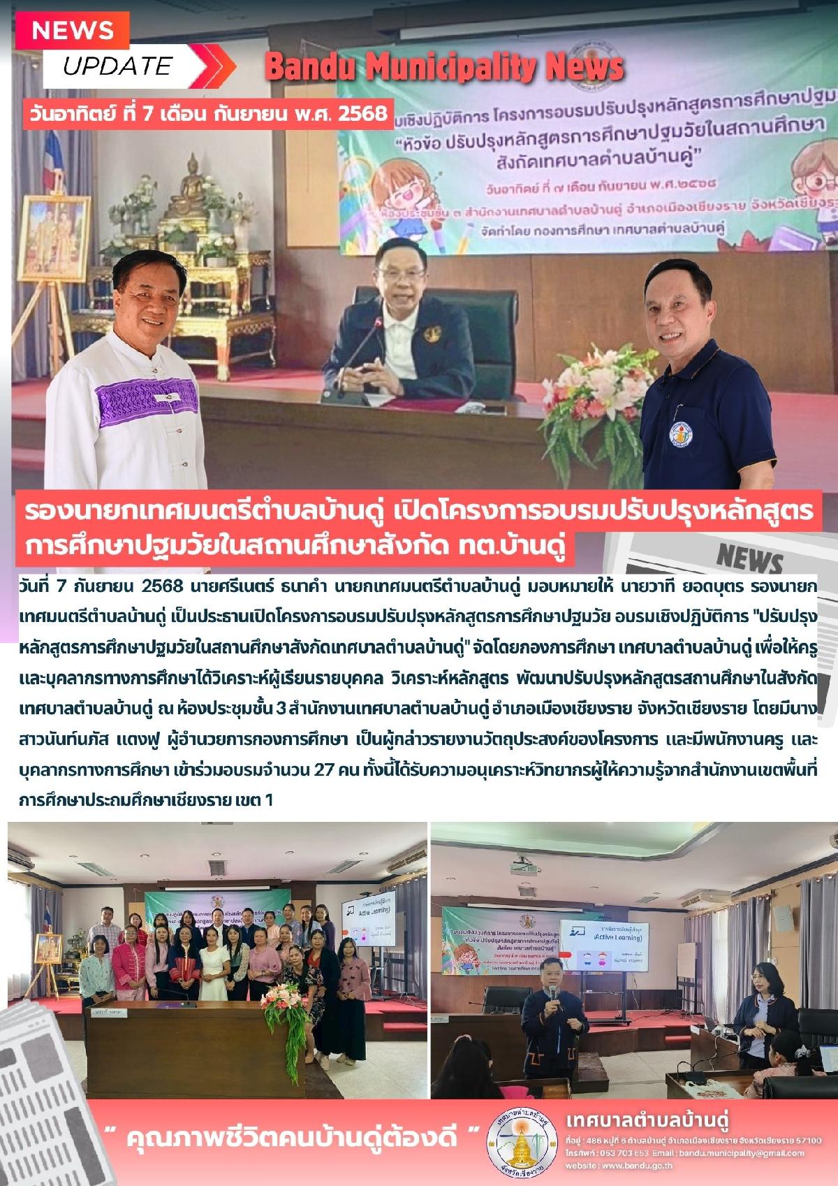 7 ก.ย. 68 รองนายกเทศมนตรีตำบลบ้านดู่ เปิดโครงการอบรมปรับปรุงหลักสูตรการศึกษาปฐมวัย อบรมเชิงปฏิบัติการ "ปรับปรุงหลักสูตรการศึกษาปฐมวัยในสถานศึกษาสังกัดเทศบาลตำบลบ้านดู่"