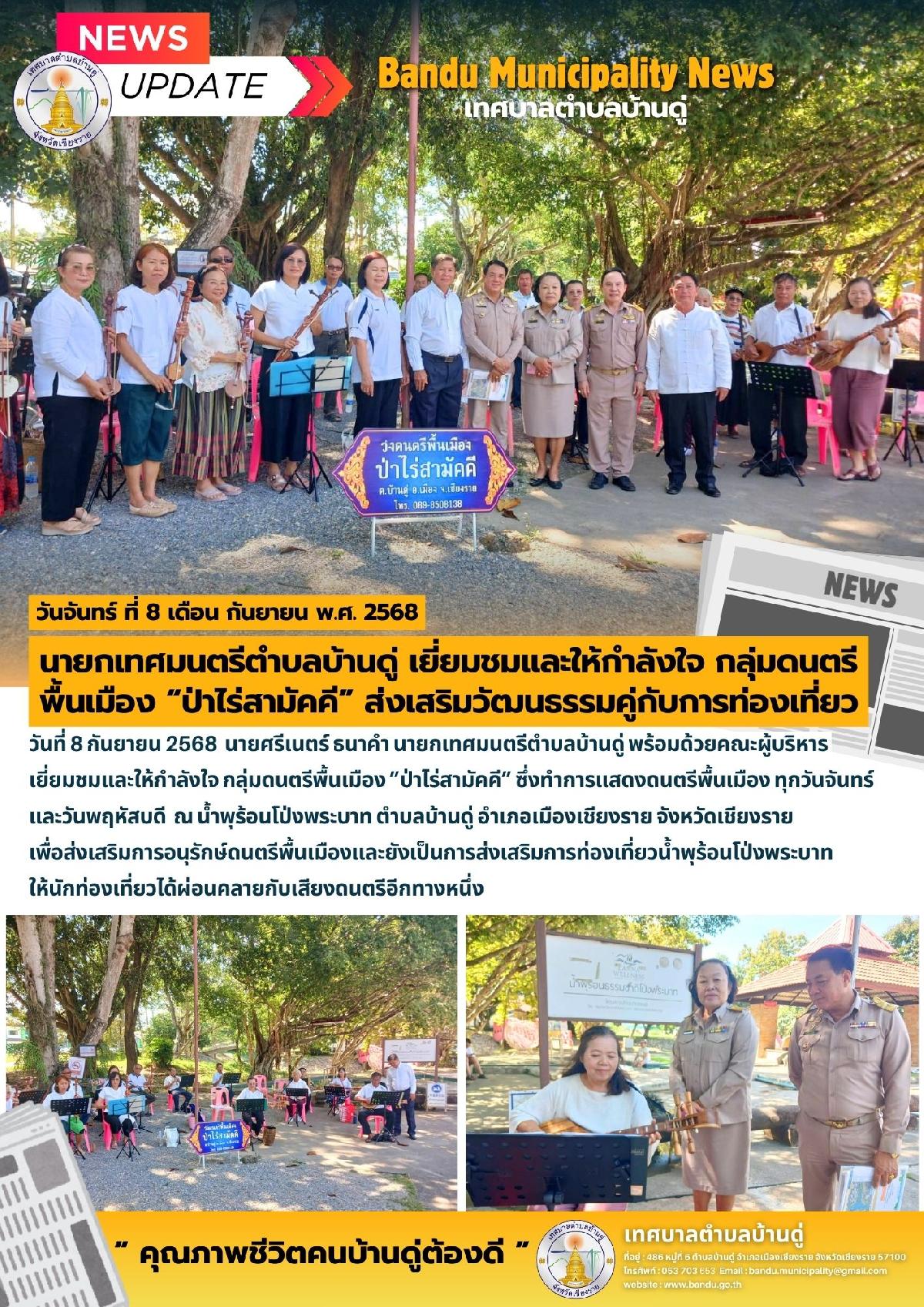 8 ก.ย. 68 นายกเทศมนตรีตำบลบ้านดู่ เยี่ยมชมและให้กำลังใจ กลุ่มดนตรีพื้นเมือง ”ป่าไร่สามัคคี”