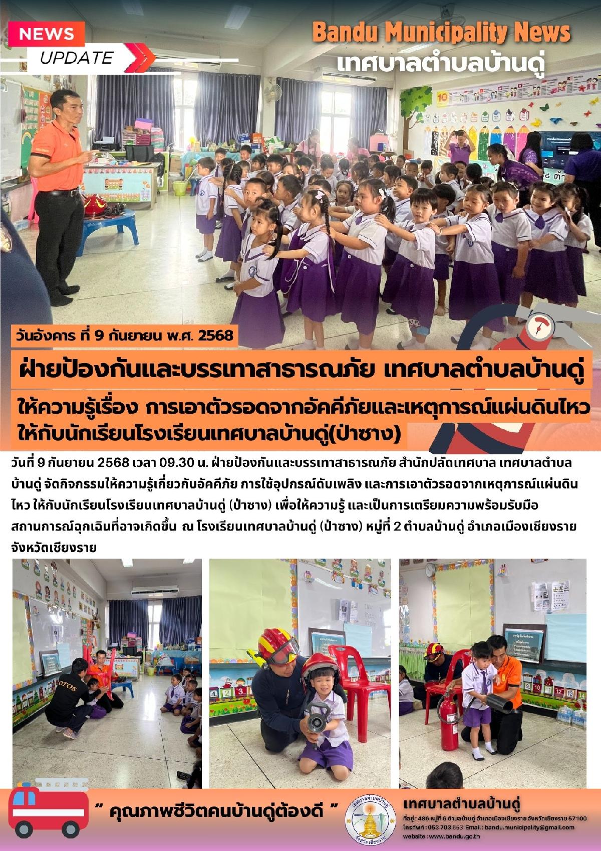 9 ก.ย. 68 ฝ่ายป้องกันและบรรเทาสาธารณภัย จัดกิจกรรมให้ความรู้เกี่ยวกับอัคคีภัย การใช้อุปกรณ์ดับเพลิง และการเอาตัวรอดจากเหตุการณ์แผ่นดินไหว ให้กับนักเรียนโรงเรียนเทศบาลบ้านดู่ (ป่าซาง)
