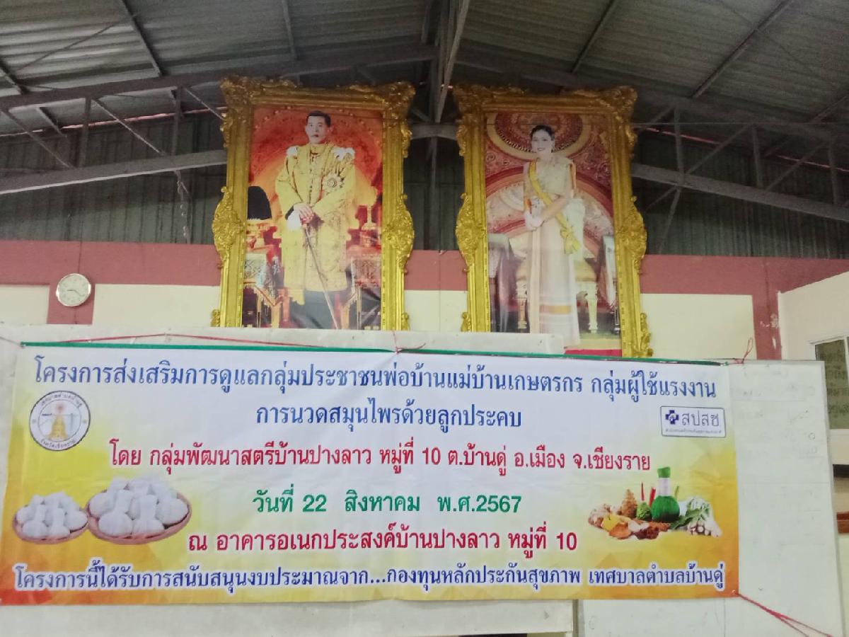 วันนี้ 22 สิงหาคม 2567 รองนายกเทศมนตรีตำบลบ้านดู่ ให้เกียรติเป็นประธานเปิดโครงการส่งเสริมการดูแลกลุ่มประชาชนพ่อบ้านแม่บ้านเกษตรกร กลุ่มผู้ใช้แรงงาน การนวดสมุนไพรด้วยลูกประคบ