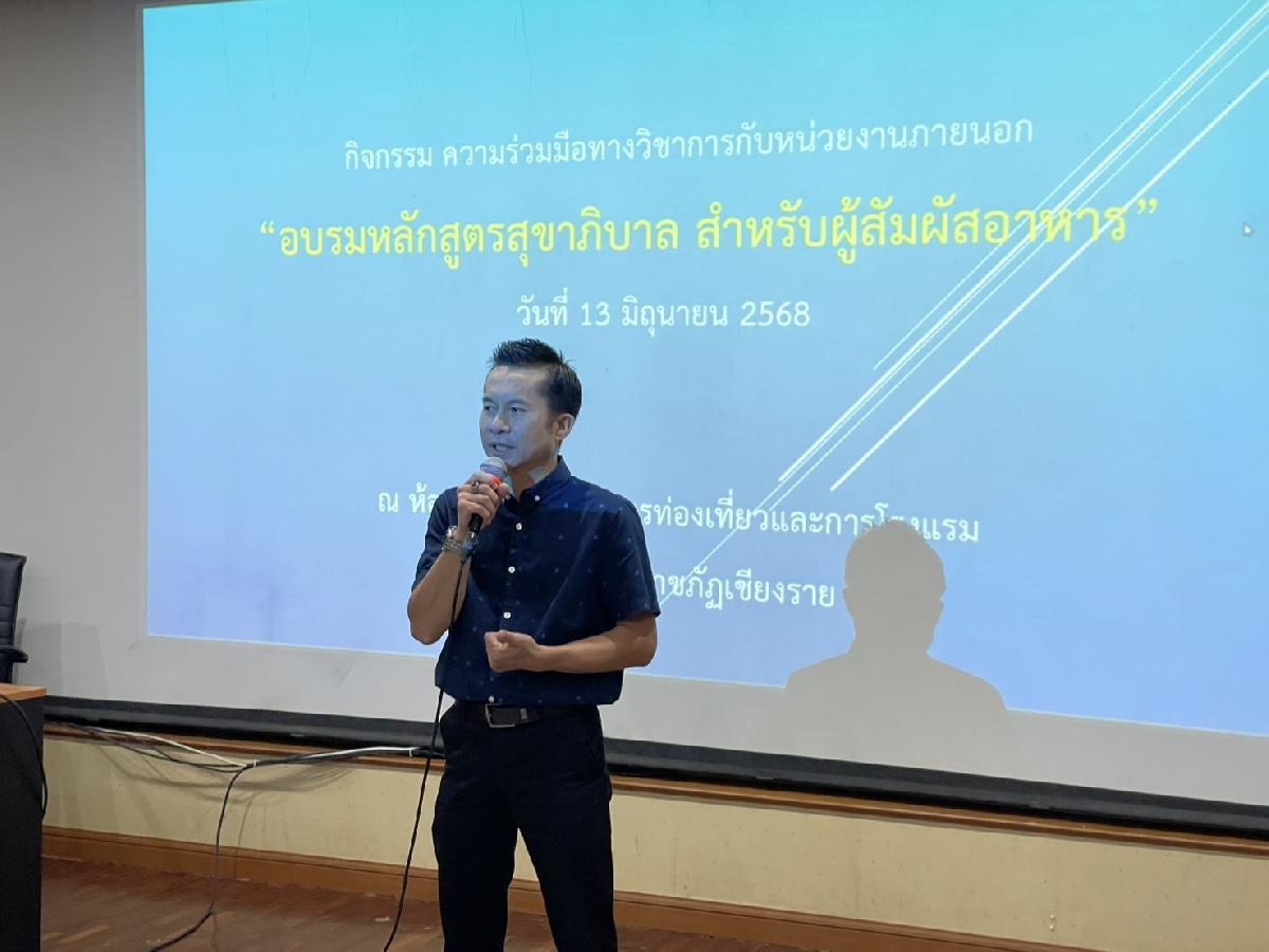 วันที่ 13 มิถุนายน 2568 กองสาธารณสุขและสิ่งแวดล้อม เทศบาลตำบลบ้านดู่ร่วมกับคณะการท่องเที่ยวและการโรงแรม มหาวิทยาลัยราชภัฏเชียงรายดำเนินการจัดอบรมหลักสูตรการสุขาภิบาลอาหารสำหรับผู้สัมผัสอาหาร