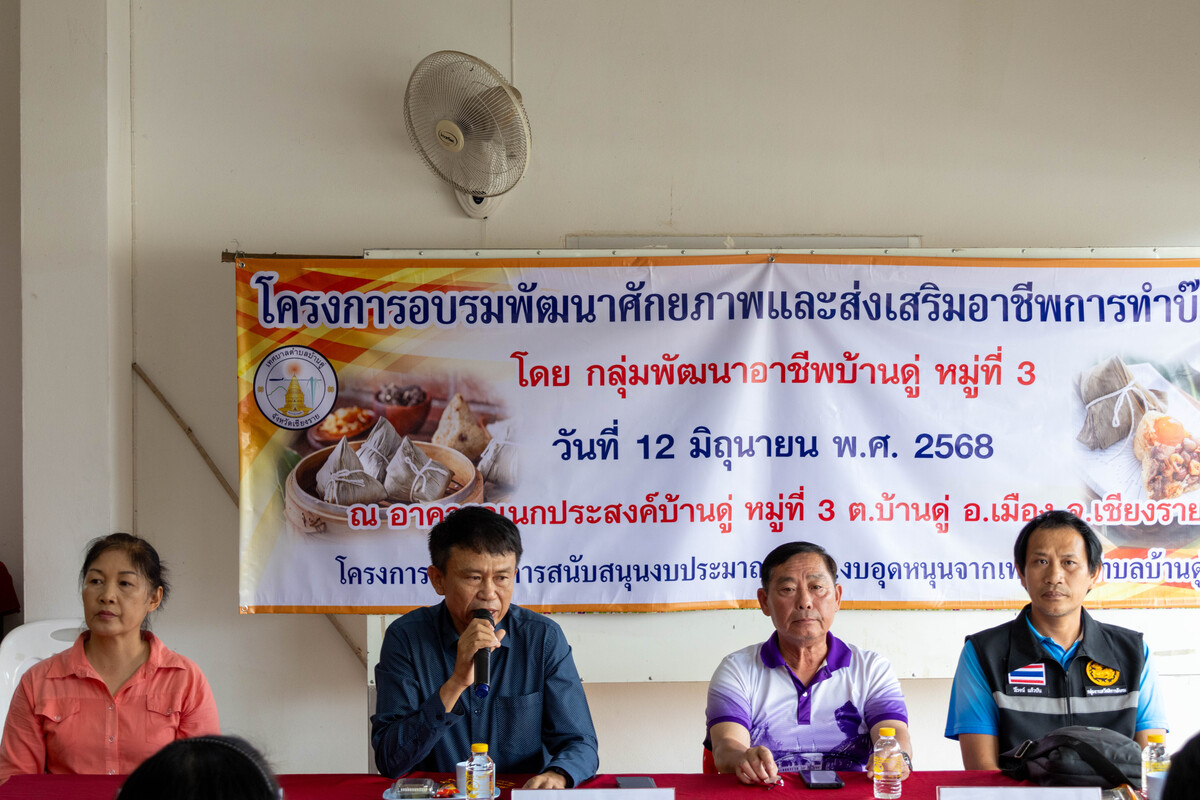 ปลัดเทศบาล ให้เกียรติเป็นประธานเปิดโครงการอบรมพัฒนาศักยและส่งเสริมอาชีพการทำบ๊ะจ่าง โดยกลุ่มผู้พิการตำบลบ้านดู่ ณ อาคารอเนกประสงค์ หมู่ 3 บ้านดู่ ตำบลบ้านดู่ อำเภอเมืองเชียงราย จังหวัดเชียงราย โดยได้รับการสนับสนุนงบประมาณจากเทศบาลตำบลบ้านดู่