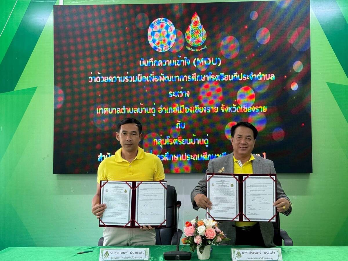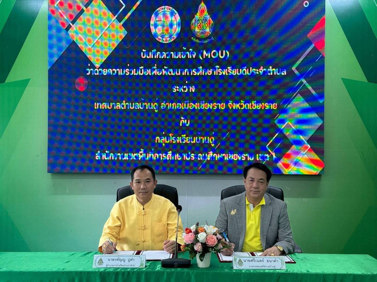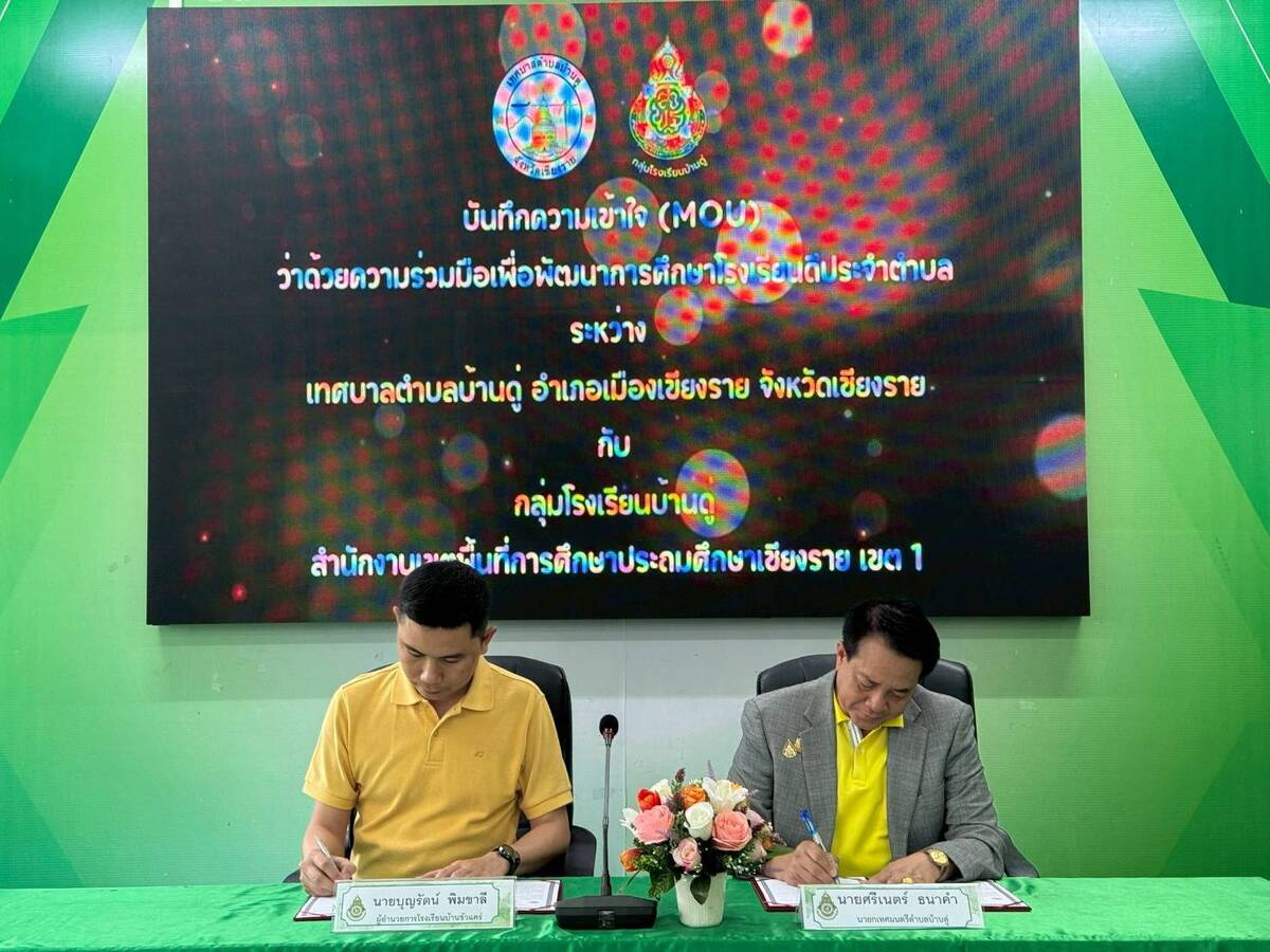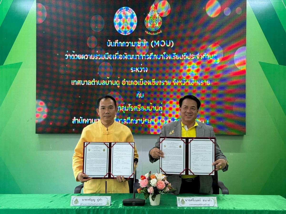 31 กรกฎาคม 2568 นายศรีเนตร์ ธนาคำ นายกเทศมนตรีตำบลบ้านดู่ ร่วมลงนามบันทึกความเข้าใจ (MOU) ว่าด้วยความร่วมมือเพื่อพัฒนาการศึกษาโรงเรียนดีประจำตำบล ร่วมกับกลุ่มโรงเรียนบ้านดู่ สำนักงานเขตพื้นที่การศึกษาประถมศึกษาเชียงราย เขต 1 ประกอบด้วย โรงเรียนบ้านดู่(สหราษฎร์พัฒนาคาร), โรงเรียนบ้านป่าสักไก่, โรงเรียนบ้านโป่งพระบาท, โรงเรียนบ้านขัวแคร่ และโรงเรียนบ้านโป่งน้ำตก เพื่อส่งเสริม และยกระดับคุณภาพการศึกฆษาของโรงเรียนดีประจำตำบล ณ ห้องประชุมดอกประดู่ โรงเรียนบ้านดู่(สหราษฎร์พัฒนาคาร) ตำบลบ่านดู่ อำเภอเมืองเชียงราย จังหวัดเชียงราย