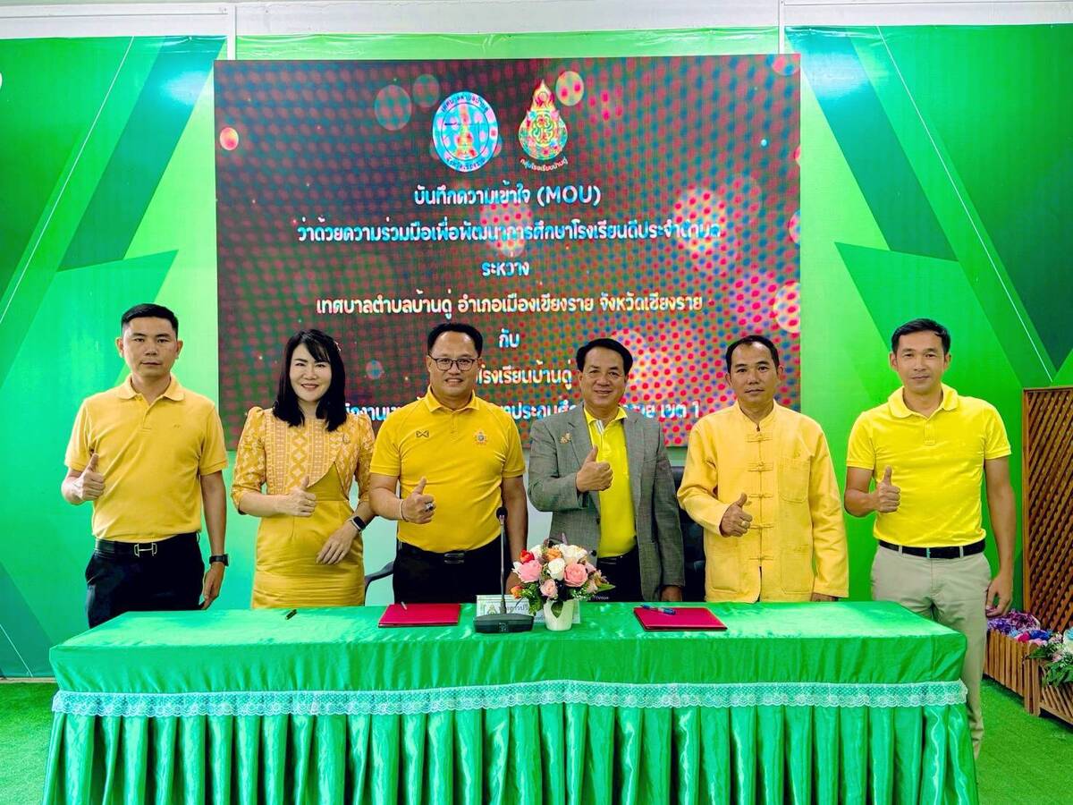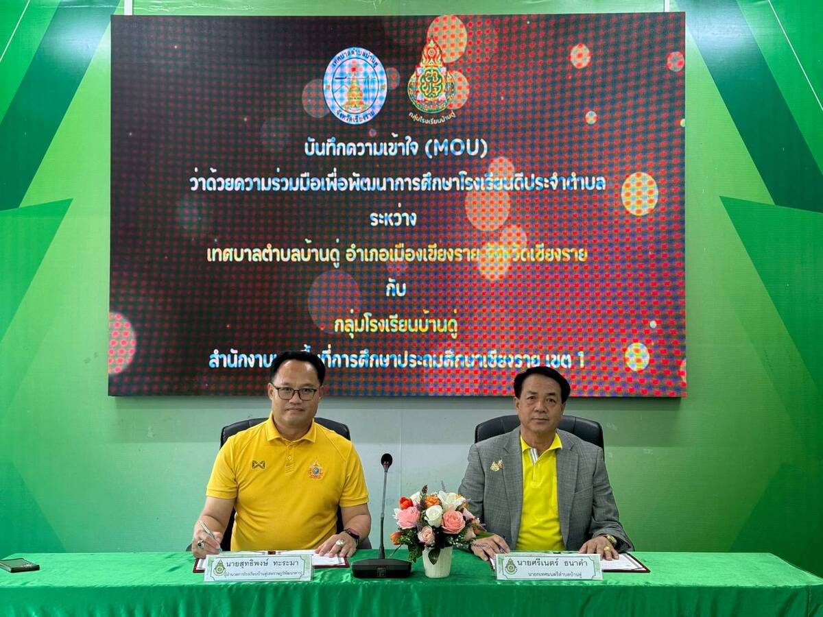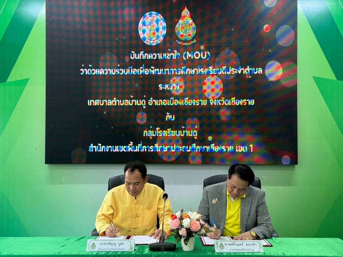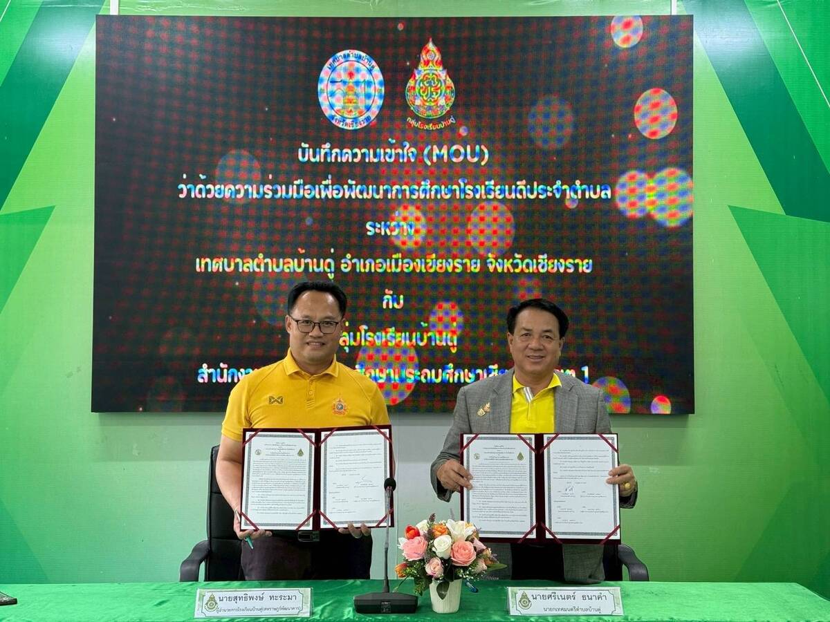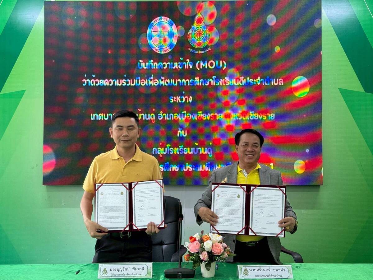 31 กรกฎาคม 2568 นายศรีเนตร์ ธนาคำ นายกเทศมนตรีตำบลบ้านดู่ ร่วมลงนามบันทึกความเข้าใจ (MOU) ว่าด้วยความร่วมมือเพื่อพัฒนาการศึกษาโรงเรียนดีประจำตำบล ร่วมกับกลุ่มโรงเรียนบ้านดู่ สำนักงานเขตพื้นที่การศึกษาประถมศึกษาเชียงราย เขต 1 ประกอบด้วย โรงเรียนบ้านดู่(สหราษฎร์พัฒนาคาร), โรงเรียนบ้านป่าสักไก่, โรงเรียนบ้านโป่งพระบาท, โรงเรียนบ้านขัวแคร่ และโรงเรียนบ้านโป่งน้ำตก เพื่อส่งเสริม และยกระดับคุณภาพการศึกฆษาของโรงเรียนดีประจำตำบล ณ ห้องประชุมดอกประดู่ โรงเรียนบ้านดู่(สหราษฎร์พัฒนาคาร) ตำบลบ่านดู่ อำเภอเมืองเชียงราย จังหวัดเชียงราย