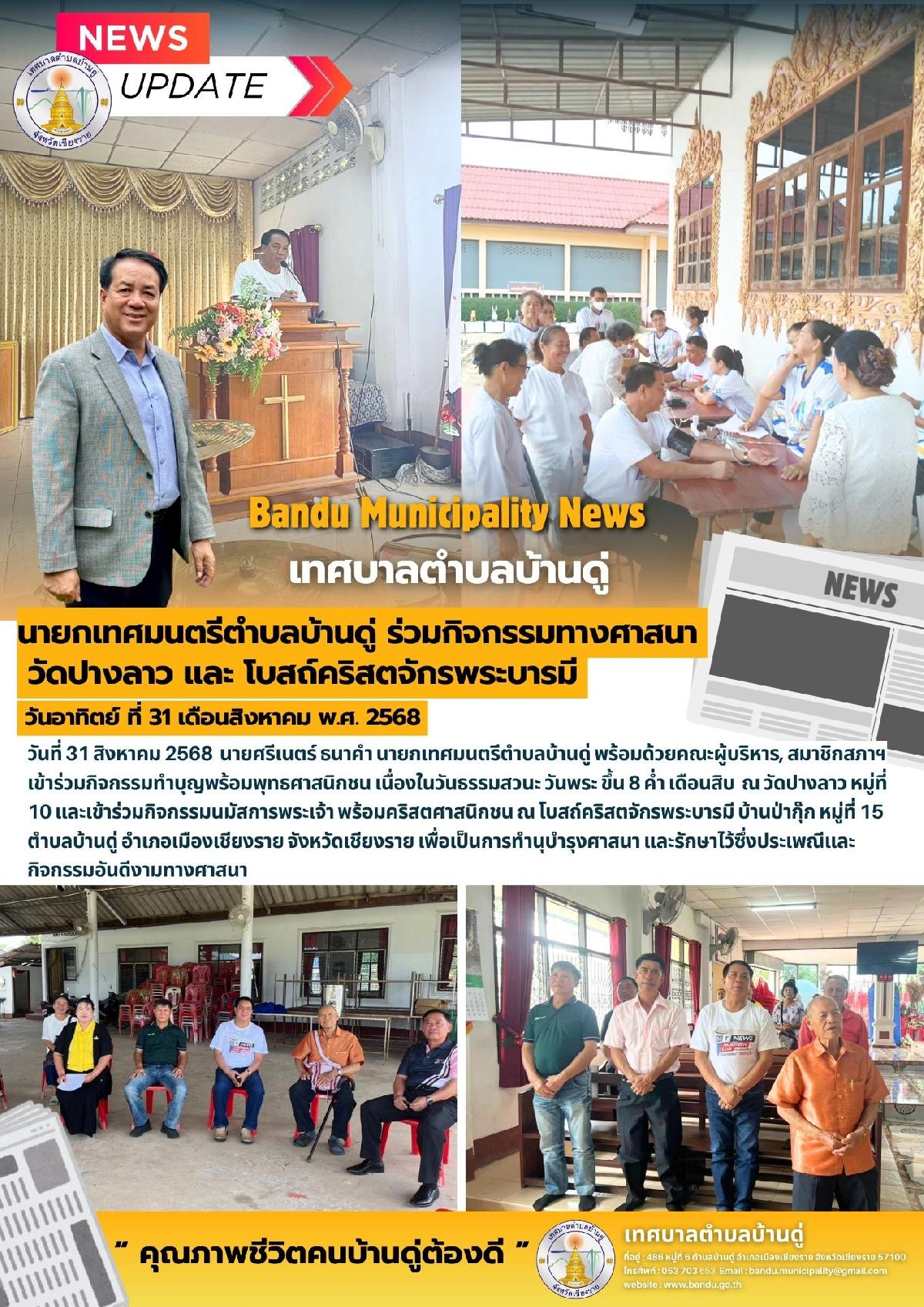 31 ส.ค. 68 นายกเทศมนตรีตำบลบ้านดู่ ร่วมกิจกรรมทางศาสนา วัดปางลาว และ โบสถ์คริสตจักรพระบารมี