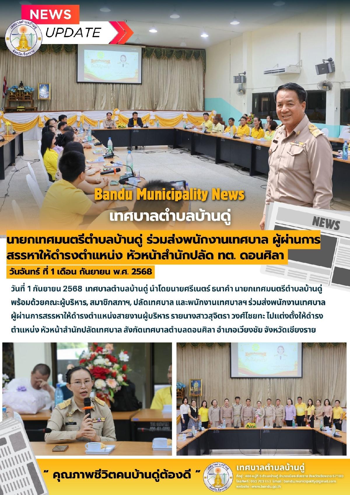 1 ก.ย. 68 นายกเทศมนตรีตำบลบ้านดู่ พร้อมคณะผู้บริหาร ร่วมส่งพนักงานเทศบาล ไปแต่งตั้งให้ดำรงตำแหน่ง หัวหน้าสำนักปลัดเทศบาล สังกัดเทศบาลตำบลดอนศิลา