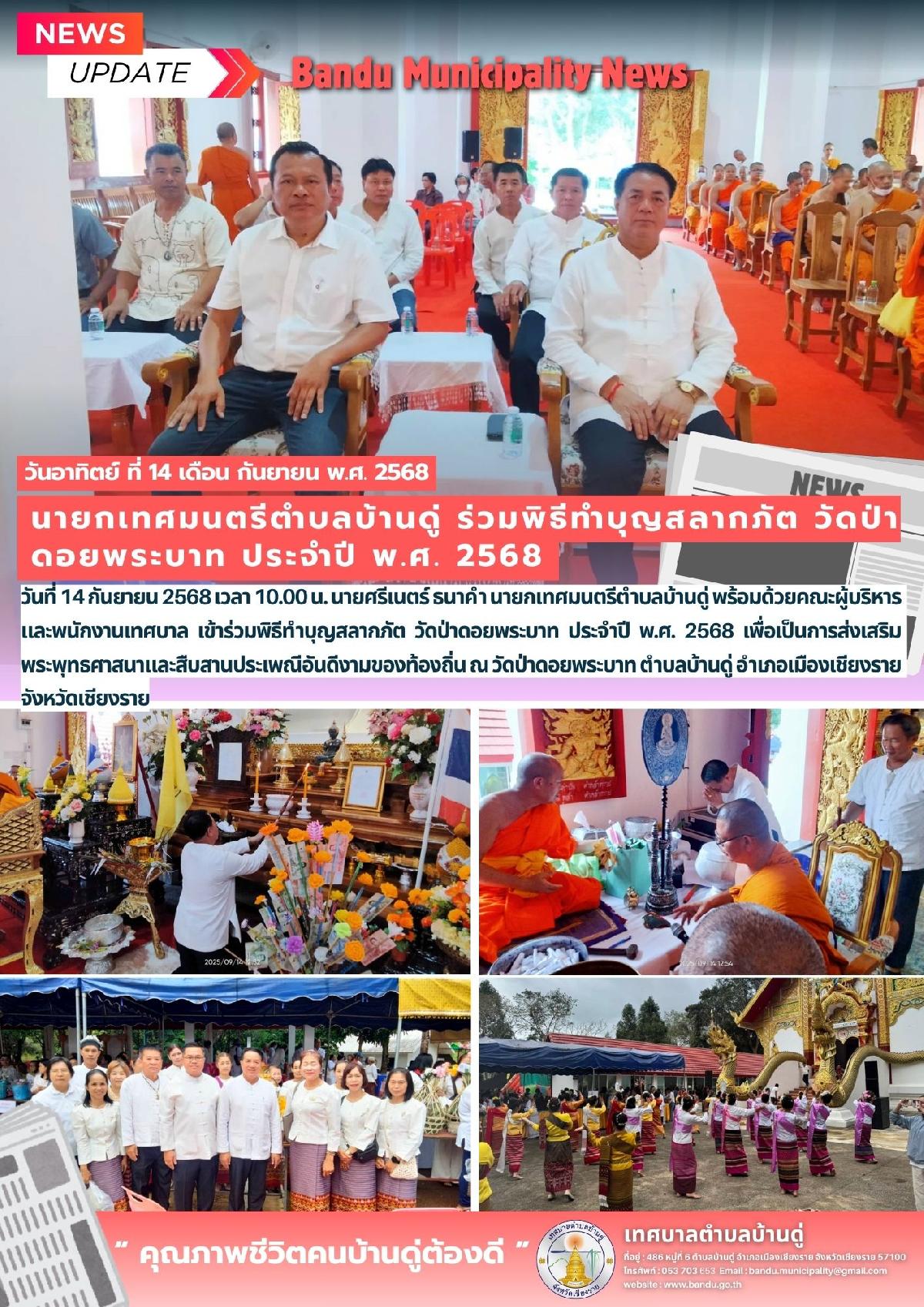 วันที่ 14 กันยายน 2568 เวลา 10.00 น. นายศรีเนตร์ ธนาคำ นายกเทศมนตรีตำบลบ้านดู่ พร้อมด้วยคณะผู้บริหาร และพนักงานเทศบาล เข้าร่วมพิธีทำบุญสลากภัต วัดป่าดอยพระบาท ประจำปี พ.ศ. 2568 เพื่อเป็นการส่งเสริมพระพุทธศาสนาและสืบสานประเพณีอันดีงามของท้องถิ่น ณ วัดป่าดอยพระบาท ตำบลบ้านดู่ อำเภอเมืองเชียงราย จังหวัดเชียงราย