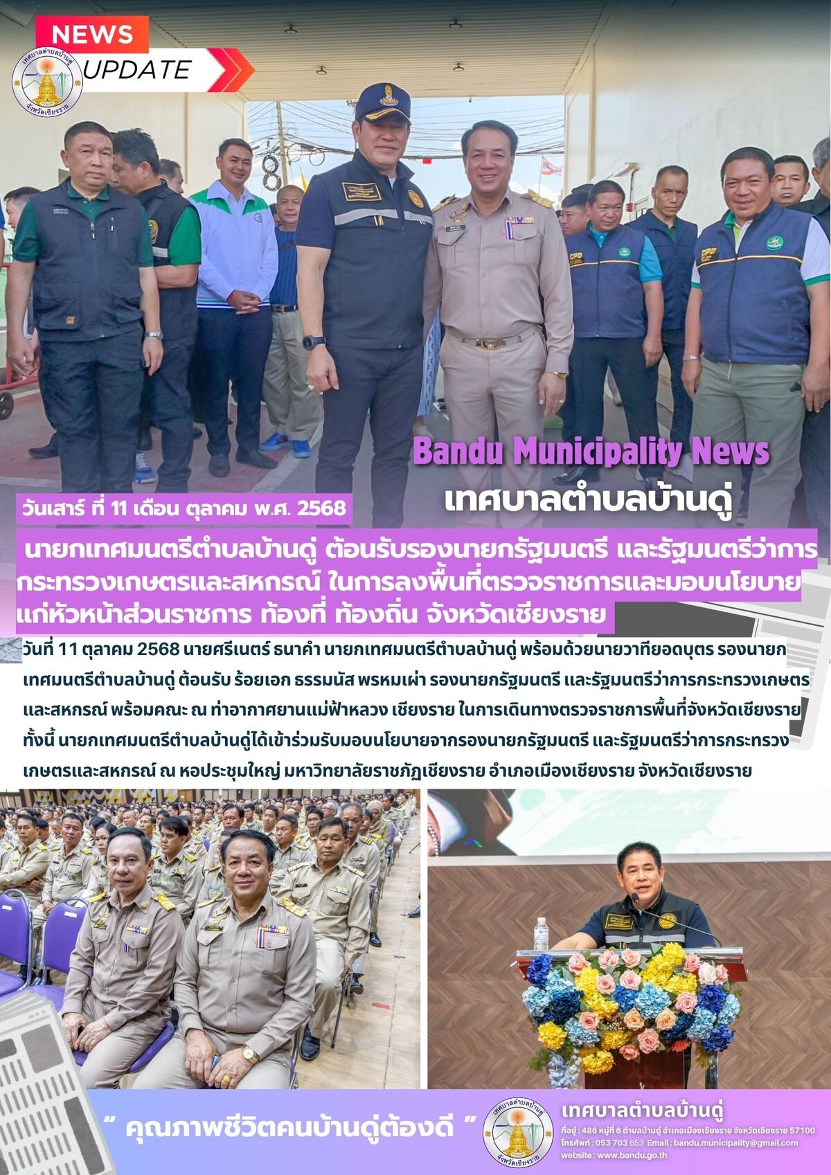 วันที่ 11 ตุลาคม 2568 นายศรีเนตร์ ธนาคำ นายกเทศมนตรีตำบลบ้านดู่ พร้อมด้วยนายวาทียอดบุตร รองนายกเทศมนตรีตำบลบ้านดู่ ต้อนรับ ร้อยเอก ธรรมนัส พรหมเผ่า รองนายกรัฐมนตรี และรัฐมนตรีว่าการกระทรวงเกษตรและสหกรณ์ พร้อมคณะ ณ ท่าอากาศยานแม่ฟ้าหลวง เชียงราย ในการเดินทางตรวจราชการพื้นที่จังหวัดเชียงราย