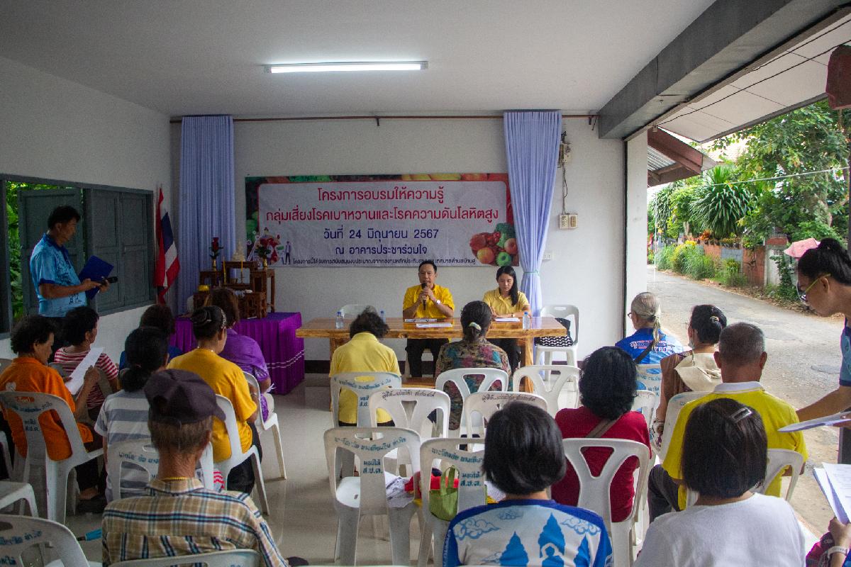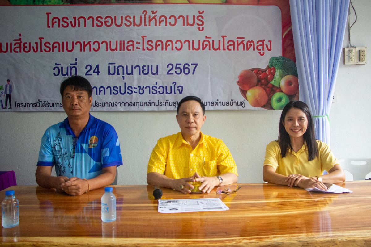 วันนี้ 24 มิถุนายน 2567 เวลา 09.00 น. นายวาที ยอดบุตร รองนายกเทศมนตรีตำบลบ้านดู่ ให้เกียรติเป็นประธานเปิดโครงการ อบรมให้ความรู้กลุ่มเสี่ยงโรคเบาหวานและโรคความดันโลหิตสูง