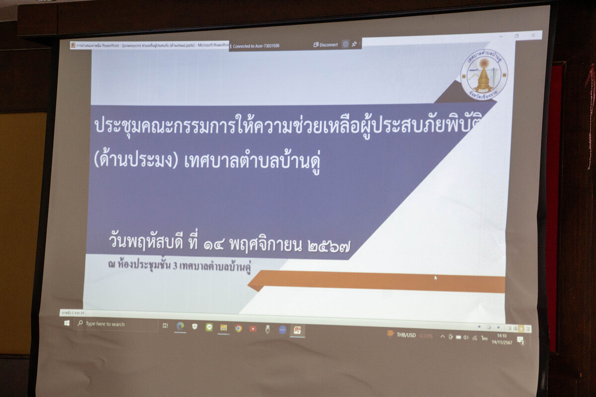 14 พฤศจิกายน 2567 เวลา 09.00 น. เทศบาลตำบลบ้านดู่ นำโดยนายวาที ยอดบุตร รองนายกเทศมนตรีตำบลบ้านดู่ ร่วมกับคณะกรรมการช่วยเหลือประชาชนเทศบาลตำบลบ้านดู่ ดำเนินการจัดประชุมคณะกรรมการช่วยเหลือประชาชนเทศบาลตำบลบ้านดู่ (กรณีผู้ประสบอุทกภัย) ครั้งที่ 5 และการประชุมคณะกรรมการให้ความช่วยเหลือผู้ประสบภัยพิบัติ (ด้านประมง) เพื่อพิจารณาความช่วยเหลือผู้ประสบอุทกภัยในเขตพื้นที่ตำบลบ้านดู่ ณ ห้องประชุมเทศบาลชั้น 3 เทศบาลตำบลบ้านดู่ อำเภอเมืองเชียงราย จังหวัดเชียงราย