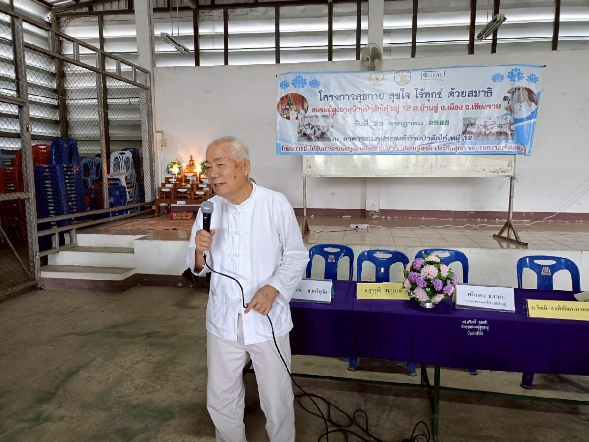 วันที่ 23 กรกฎาคม 2568 เวลา 09.00 น. นายศรีเนตร์ ธนาคำ นายกเทศมนตรีตำบลบ้านดู่ ให้เกียรติเป็นประธานเปิดโครงการสุขกาย สุขใจ ไร้ทุกข์ ด้วยสมาธิ ณ อาคารอเนกประสงค์บ้านป่าสักไก่ หมู่ที่ 12