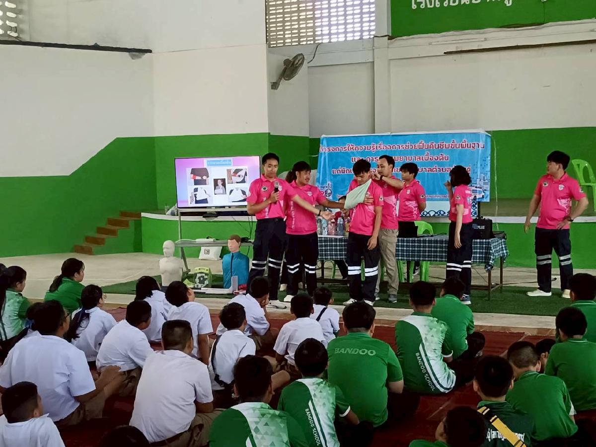 วันนี้ 18 สิงหาคม 2568 เวลา 13.00 น. นางเพ็ญรำไพ โพธิ์เกตุ รองนายกเทศมนตรีตำบลบ้านดู่ ให้เกียรติเป็นประธานเปิดโครงการให้ความรู้เรื่องการช่วยฟื้นคืนชีพขั้นพื้นฐาน และปฐมพยาบาลเบื้องต้นแก่นักเรียนในเขตเทศบาลตำบลบ้านดู่ ณ ศูนย์พละศึกษาโรงเรียนบ้านดู่(สหราษฎร์พัฒนาคาร) ตำบลบ้านดู่ อำเภอเมืองเชียงราย จังหวัดเชียงราย โดยโครงการนี้ได้รับการสนับสนุนงบประมาณจาก กองทุนหลักประกันสุขภาพ เทศบาลตำบลบ้านดู่