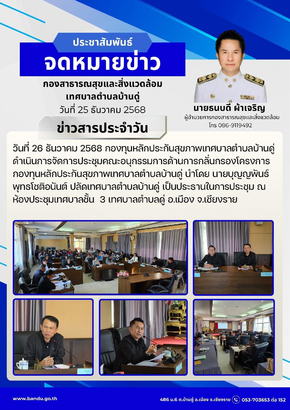 วันที่ 26 ธันวาคม 2568 กองทุนหลักประกันสุขภาพเทศบาลตำบลบ้านดู่ดำเนินการจัดการประชุมคณะอนุกรรมการด้านการกลั่นกรองโครงการกองทุนหลักประกันสุขภาพเทศบาลตำบลบ้านดู่ นำโดย นายบุญญพันธ์ พุทธโชติอนันต์ ปลัดเทศบาลตำบลบ้านดู่ เป็นประธานในการประชุม ณ ห้องประชุมเทศบาลชั้น 3 เทศบาลตำบลดู่ อ.เมือง จ.เชียงราย