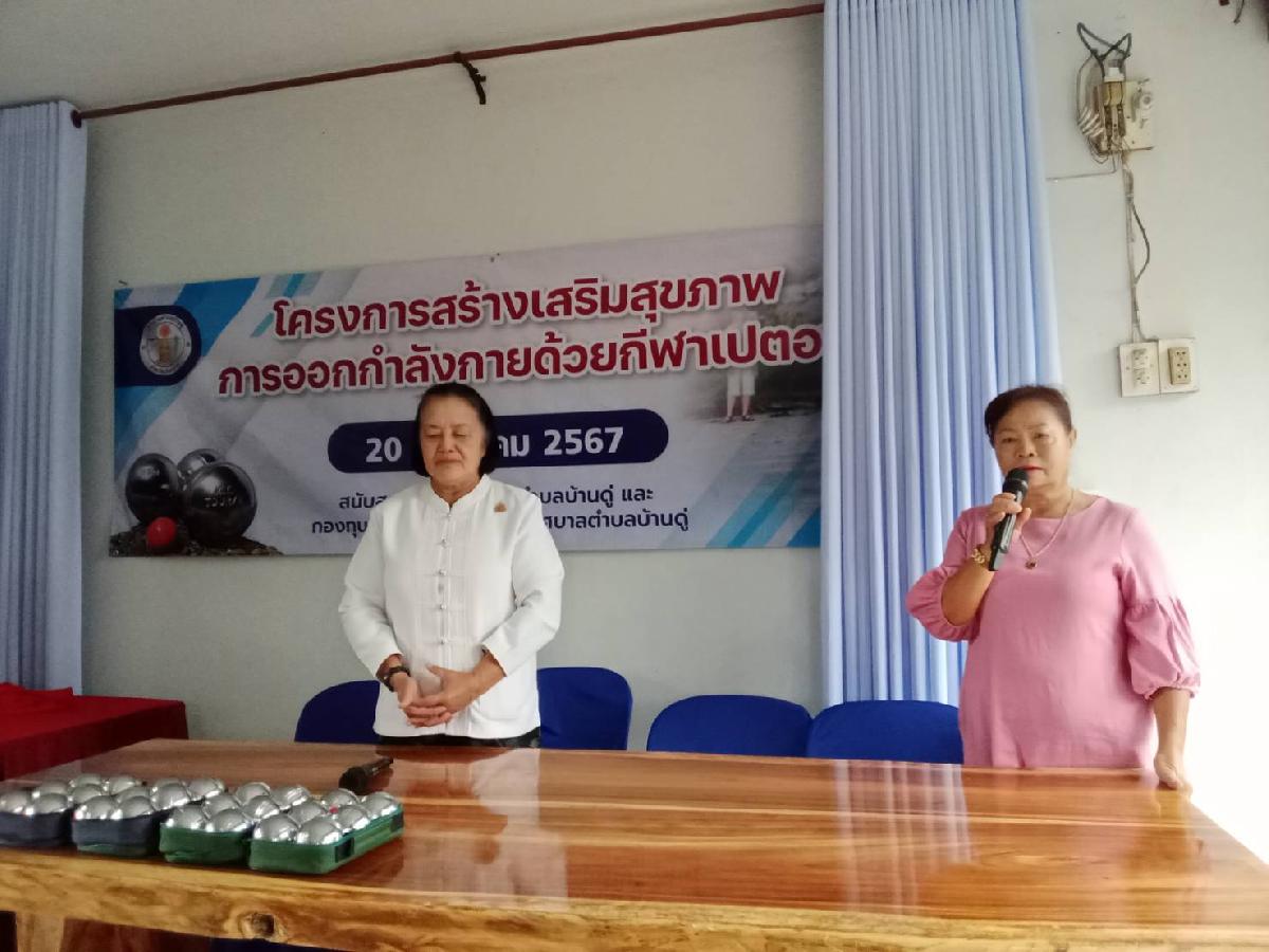 วันนี้ 20 สิงหาคม 2567 เวลา 09.00 น. นางพีระพรรณ ศิริกุล รองนายกเทศมนตรีตำบลบ้านดู่ ให้เกียรติเป็นประธานเปิดโครงการสร้างเสริมสุขภาพการออกกำลังกายด้วยกีฬาเปตอง ณ อาคารอเนกประสงค์บ้านสันปอแตง หมู่ที่ 20 ตำบลบ้านดู่ อำเภอเมืองเชียงราย จังหวัดเชียงราย โดยโครงการนี้ได้รับการสนับสนุนงบประมาณจาก กองทุนหลักประกันสุขภาพ เทศบาลตำบลบ้านดู่