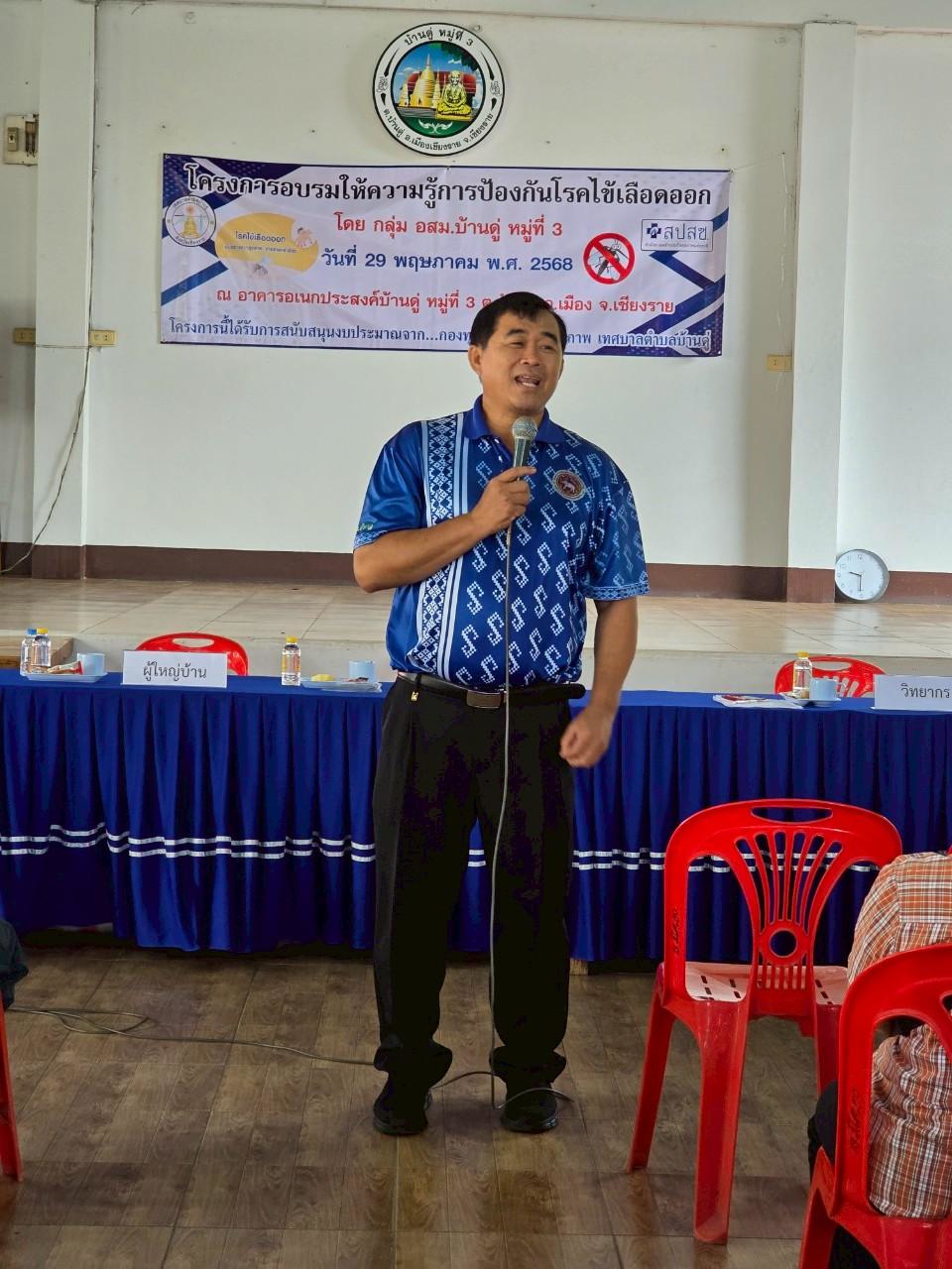 เมื่อวันที่ 29 พฤศภาคม 2568 นายบุญญพันธ์ พุทธโชติอนันต์ ปลัดเทศบาลตำบลบ้านดู่ ให้เกียรติเป็นประธานเปิดโครงการอบรมให้ความรู้การป้องกันโรคไข้เลือดออก ณ อาคารอเนกประสงค์บ้านดู่ หมู่ที่ 3 ตำบลบ้านดู่ อำเภอเมืองเชียงราย จังหวัดเชียงราย โดยโครงการนี้ได้รับการสนับสนุนงบประมาณจาก กองทุนหลักประกันสุขภาพ เทศบาลตำบลบ้านดู่
