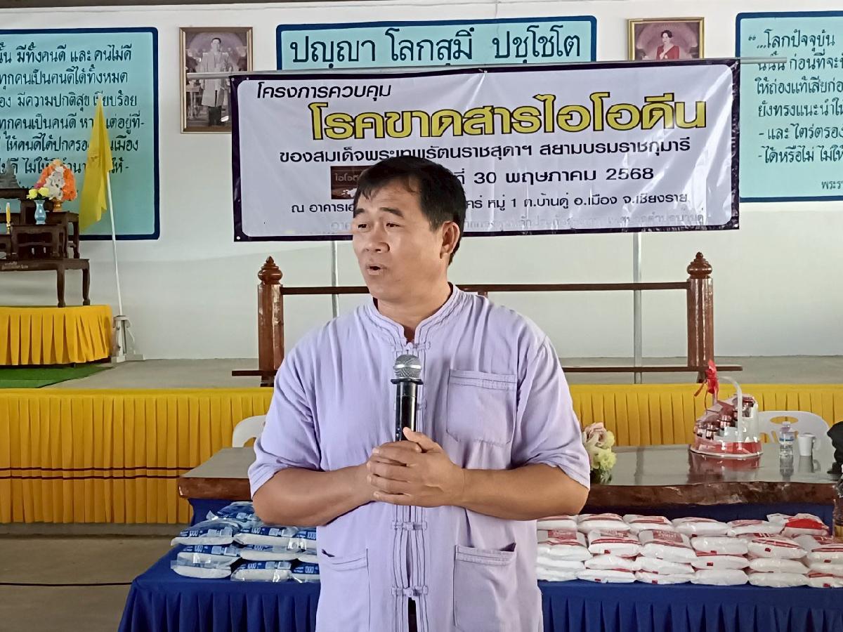 วันที่ 30 พฤศภาคม 2568 กองสาธารณสุขและสิ่งแวดล้อมเทศบาลตำบลบ้านดู่ได้เข้าร่วมโครงควบคุมโรคขาดสารไอโอดีน ของสมเด็จพระเทพรัตนราชสุดา ฯ สยามบรมราชกุมารี ณ อาคารอเนกประสงค์ หมู่ที่ 1 (เกาะทอง) บ้านขัวแคร่ ตำบลบ้านดู่ อำเภอเมืองเชียงราย จังหวัดเชียงราย