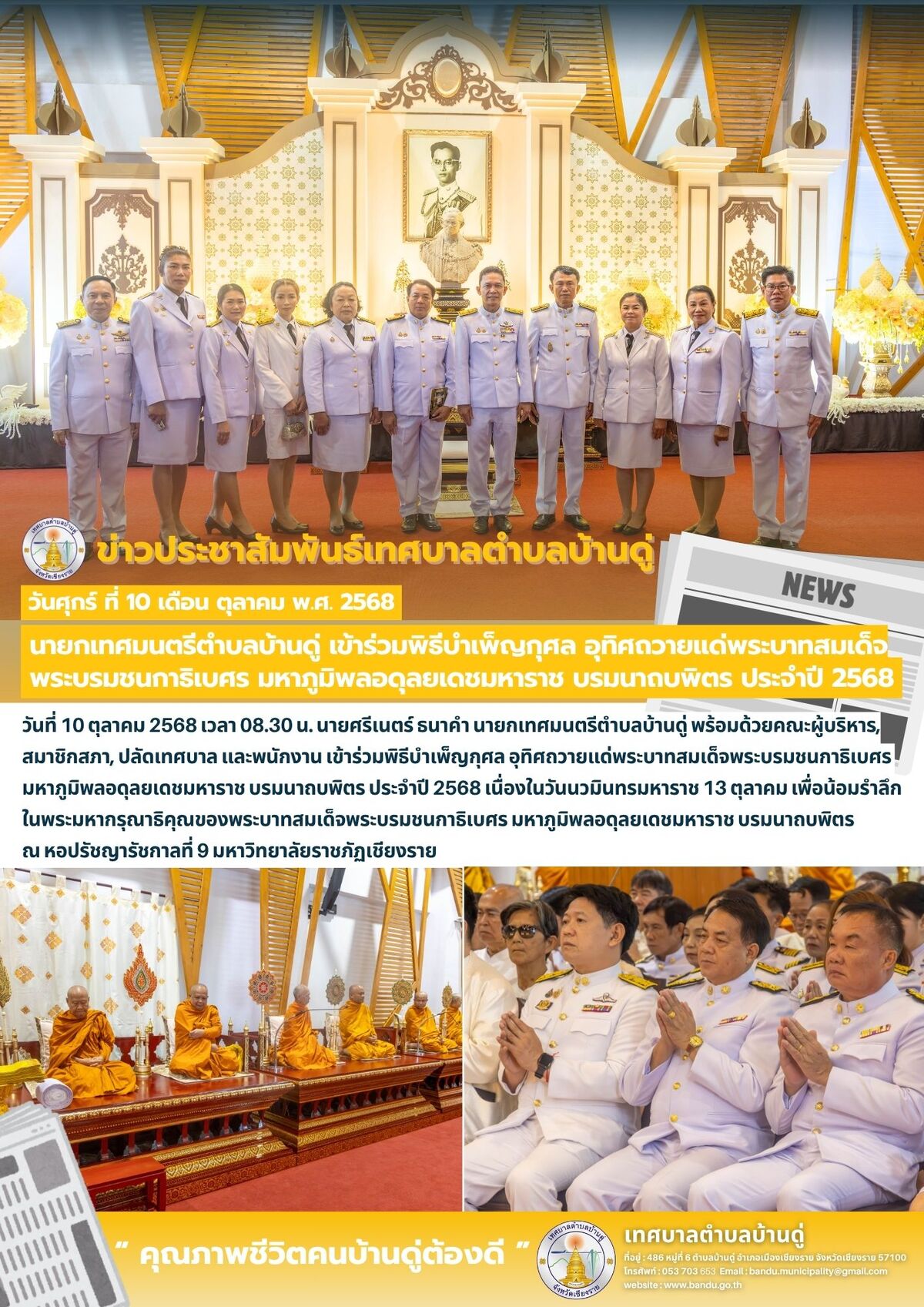 10 ต.ค. 68 เทศบาลตำบลบ้านดู่ เข้าร่วมพิธีบำเพ็ญกุศล อุทิศถวายแด่พระบาทสมเด็จพระบรมชนกาธิเบศร มหาภูมิพลอดุลยเดชมหาราช บรมนาถบพิตร ประจำปี 2568