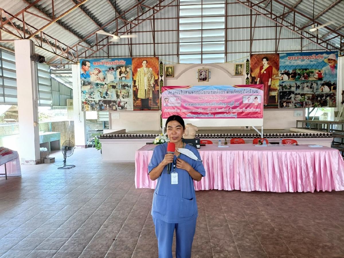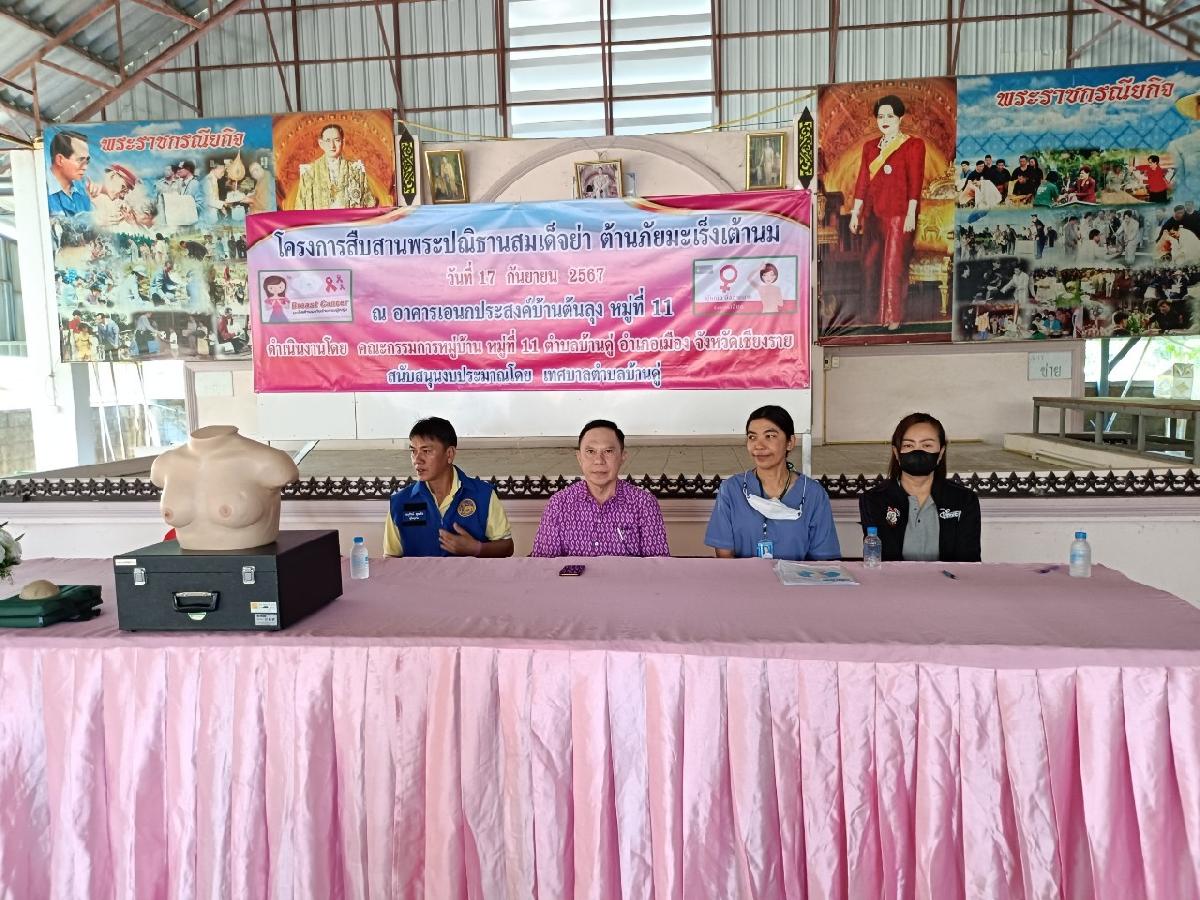 เมื่อวันที่ 17 กรกฎาคม 2567 เวลา 09.00 น. นายวาที ยอดบุตร รองนายกเทศมนตรีตำบลบ้านดู่ ให้เกียรติเป็นประธานเปิดโครงการสืบสานพระปณิธานสมเด็จย่า ต้านภัยมะเร็งเต้านม โครงการพระราชดำริด้านสาธารณสุข ณ อาคารอเนกประสงค์บ้านต้นลุง หมู่ที่ 11 ตำบลบ้านดู่ อำเภอเมืองเชียงราย จังหวัดเชียงราย