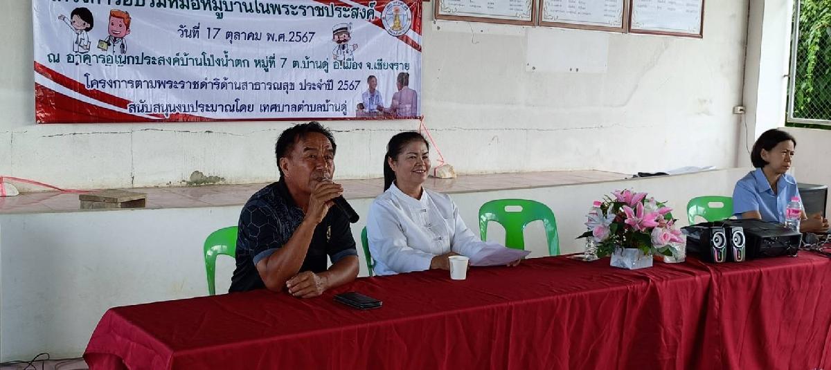 วันนี้ 17 ตุลาคม 2567 เวลา 09.00 น. นางสาวนิรชา เรือนคำ ที่ปรึกษานายกเทศมนตรีตำบลบ้านดู่ ให้เกียรติเป็นประธานเปิดโครงการพระราชดำริด้านสาธารณสุข โครงการอบรมหมอหมู่บ้านในพระราชประสงค์ ณ อาคารอเนกประสงค์บ้านโป่งน้ำตก หมู่ 7 อำเภอเมืองเชียงราย จังหวัดเชียงราย โดยมีสมาชิกสภาเทศบาลตำบลบ้านดู่ เข้าร่วมการเปิดโครงการในครั้งนี้ ซึ่งโครงการได้รับสนับสนุนงบประมาณจากเทศบาลตำบลบ้านดู่
