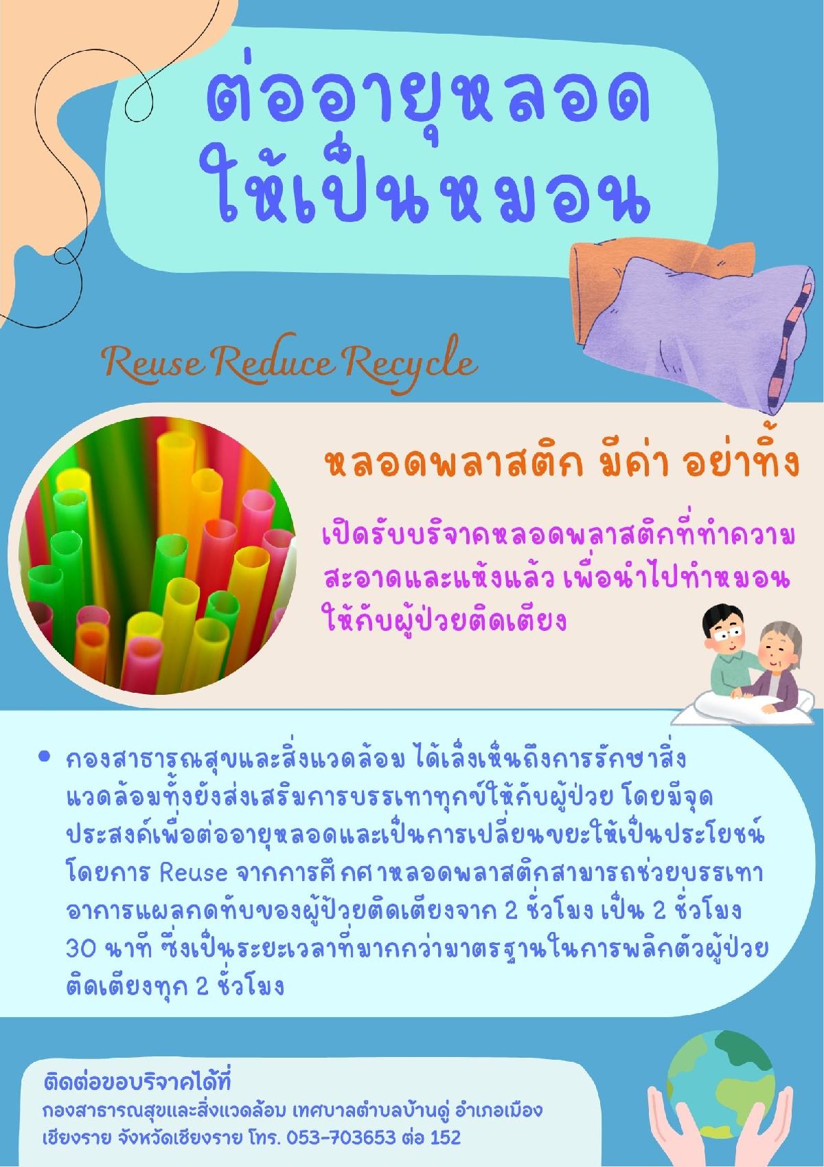 กองสาธารณสุขและสิ่งแวดล้อม เปิดรับบริจาคหลอดพลาสติกที่ทำความสะอาดและแห้งแล้ว เพื่อนำไปทำหมอนให้กับผู้ป่วยติดเตียงซึ่งสามารถลดบรรเทาอาการแผลกดทับของผู้ป่วยและยังเป็นการนำขยะมาแปรรูปนำมาใช้ใหม่