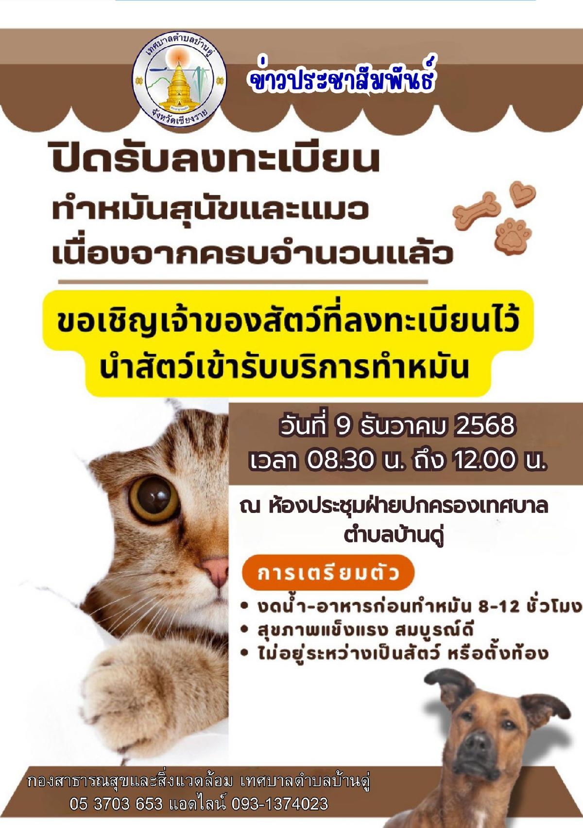 เทศบาลตำบลบ้านดู่ขอประชาสัมพันธ์ ปิดรับลงทะเบียนทำหมันสุนัขและแมวเนื่องจากครบจำนวนแล้ว หามีข้อสอบถามสามารถ โทร 053703653ต่อ152